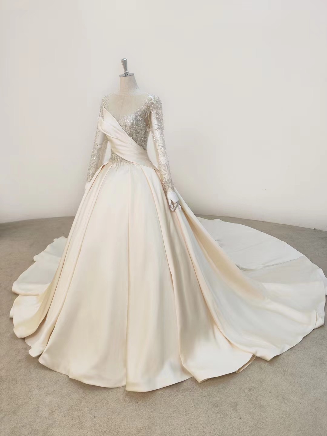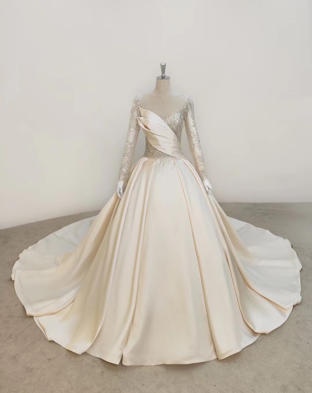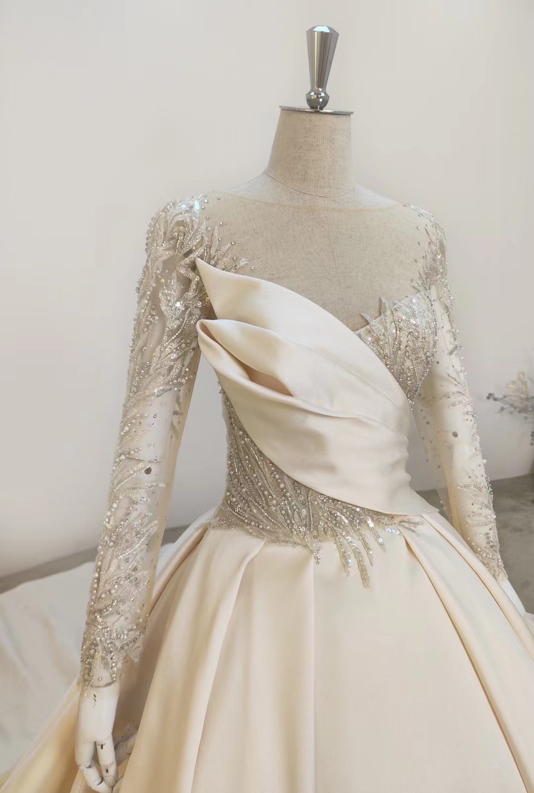 Delicate ruched design and sequin bead embellishment long sleeve wedding dress