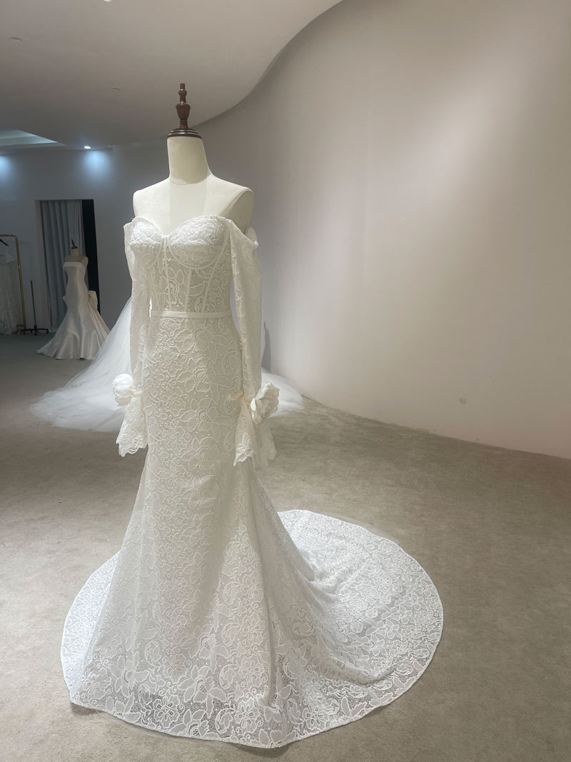 White Mermaid Wedding Gown Embroidered Lace Bridal Dress