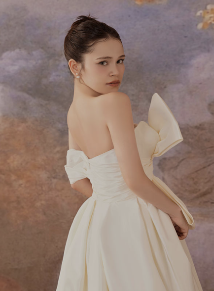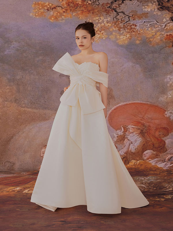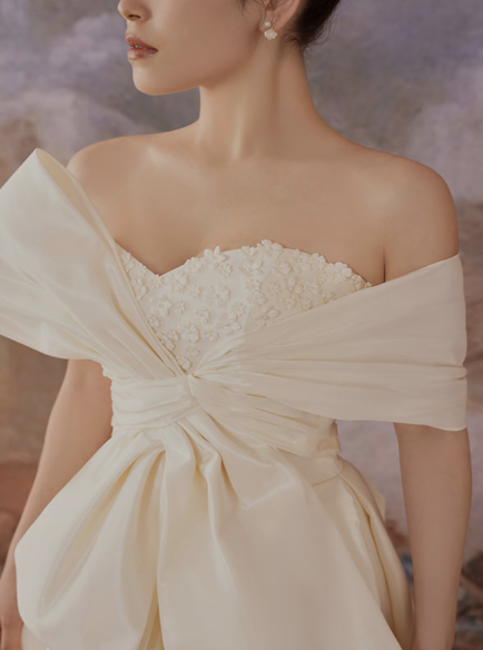 Gorgeous A-Line Satin One-shoulder with Beaded Bustier and Bow Wedding Bridal Dress