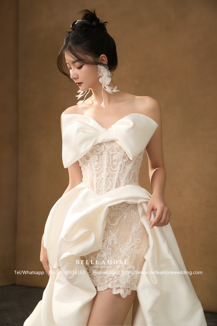 Petite girls are not suitable for long-tailed wedding dresses, because too long wedding dresses will make you look shorter. It is recommended to choose a short wedding dress like this one, which is short in front and long in the back. Exposing the calves can help lengthen the proportion of the lower body and make it look taller visually. The simple design will not make it too long.